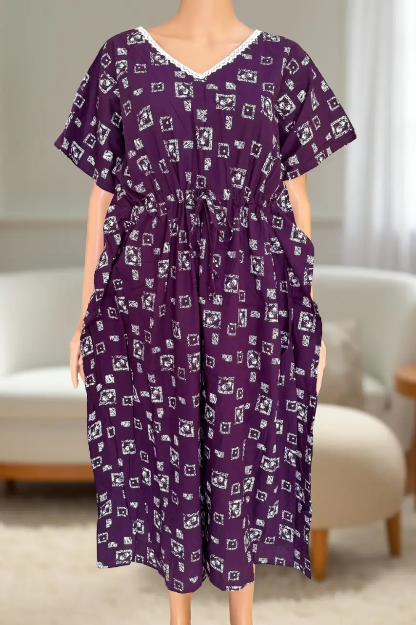 The elegant purple print adds a graceful touch, making it perfect for warm weather, casual lounging, and everyday home routines. Lightweight and easy to wear, this short kaftan blends comfort with understated style.