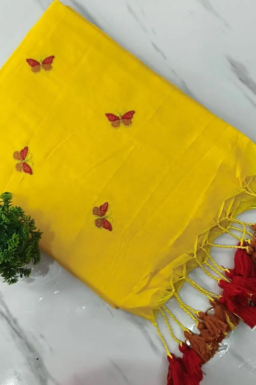Soft and breathable mulmul cotton saree with elegant embroidery. Available in Yellow, Black, Pink, and White, perfect for everyday and casual wear.
