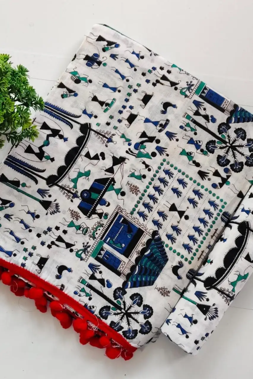 & Free ShippingWhite cotton saree with tribal prints and a red pom-pom border, light and comfortable for everyday wear.