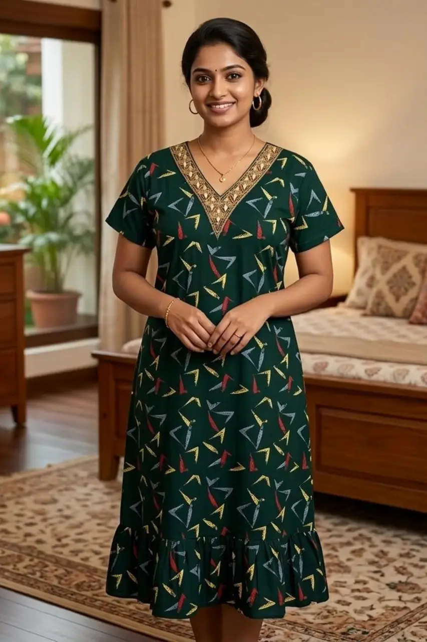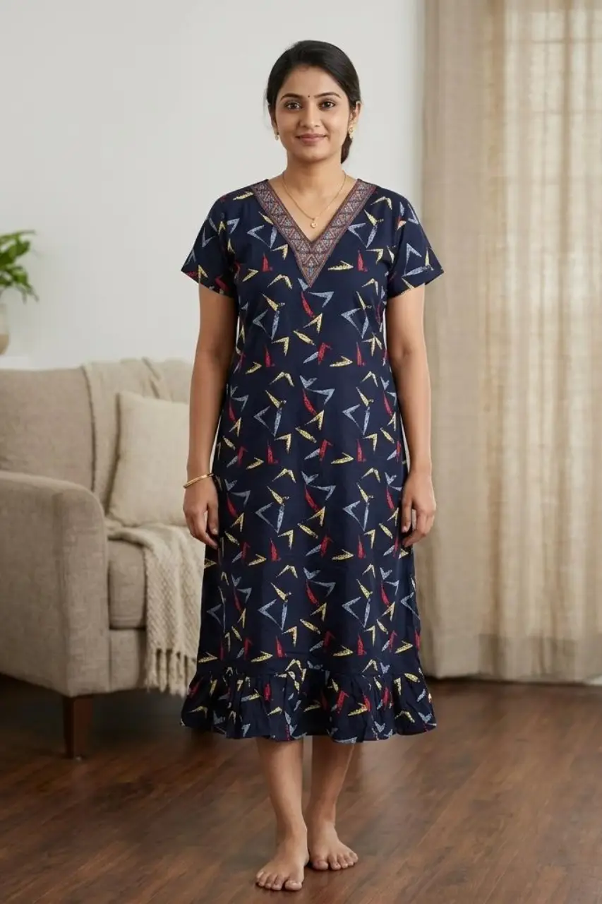 Soft and breathable frock nighty made from pure cotton for all-day comfort. Designed with a stylish V-neck, short sleeves, and a relaxed fit, making it perfect for comfortable sleep and everyday home wear. Available in multiple elegant colors.