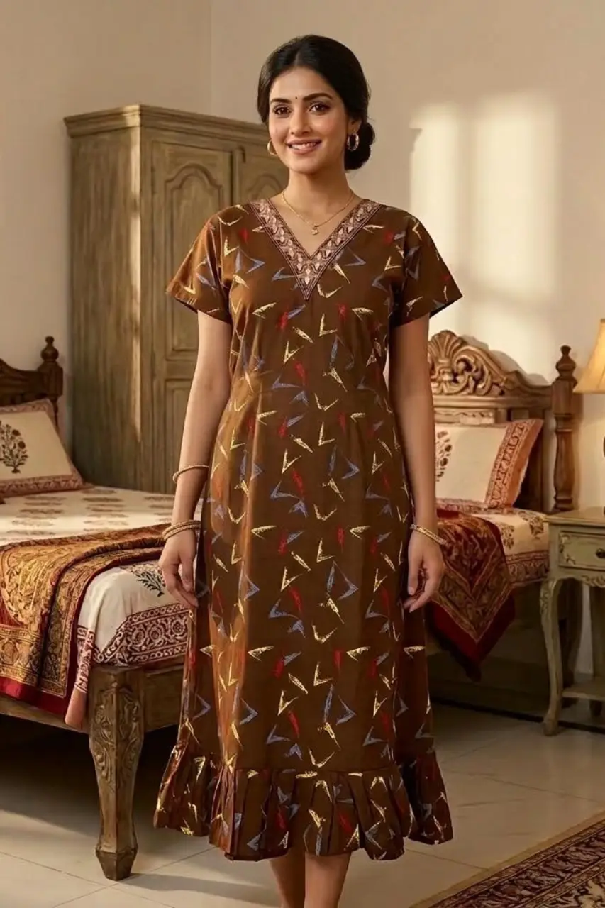 Experience comfort and style with this beautifully designed frock nighty made from soft and breathable pure cotton fabric. Crafted for everyday comfort, this nightdress features a stylish V-neckline with elegant detailing that enhances its overall look.