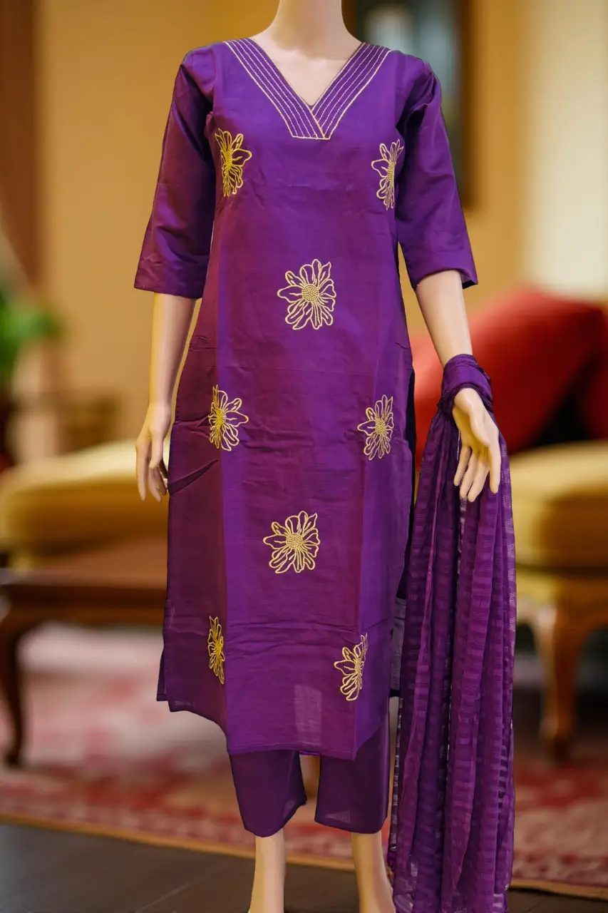This purple churidar set is made from soft and comfortable Vatican fabric, designed for both elegance and everyday comfort. It features delicate embroidery that adds a graceful touch to the outfit. The set includes a matching churidar bottom and dupatta, making it a complete and stylish look. It is ideal for casual wear, small functions, and festive gatherings.
