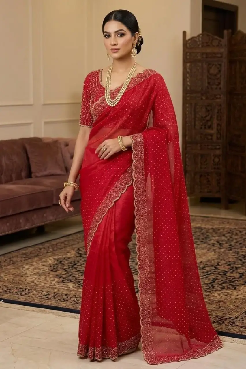 Paired with a matching embellished blouse, this saree offers a perfect blend of traditional charm and modern refinement. Style it with classic gold or pearl jewellery to complete a regal and captivating look. Designed for women who love elegance with a touch of glamour, this saree is a must-have addition to your festive wardrobe.